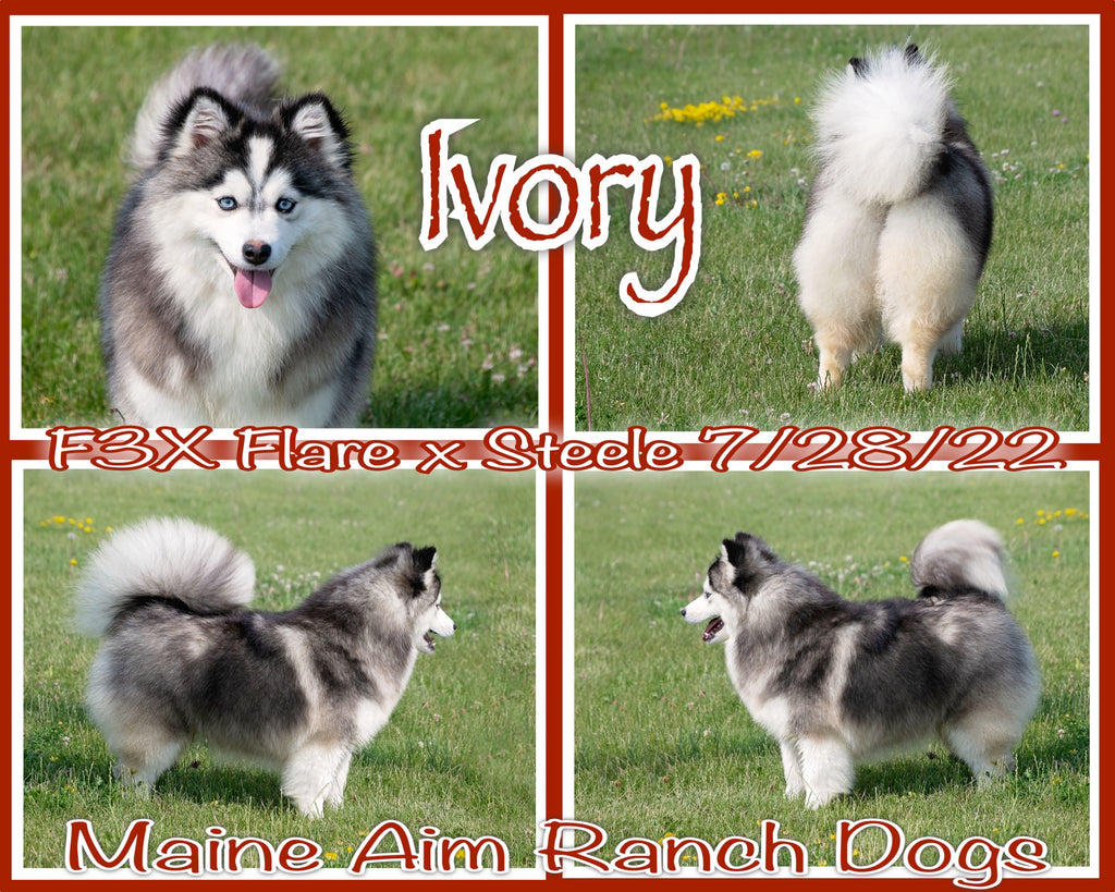 Check out this incredible girl Maine Aim's Miss Ivory born 7/28/22 is exactly what we stride to raise. She is beautiful and sweet as could be and weighs around 18lbs. She is out of Flare & Steele and we have raised some amazing pups out of her and she is now looking for her forever family. Ivory has been shown several times at Pomsky shows and has done very well. Contact me if you are interested in Ivory, she is not yet spayed but arrangements could be made after she weans off this pup at the end of October 2025.