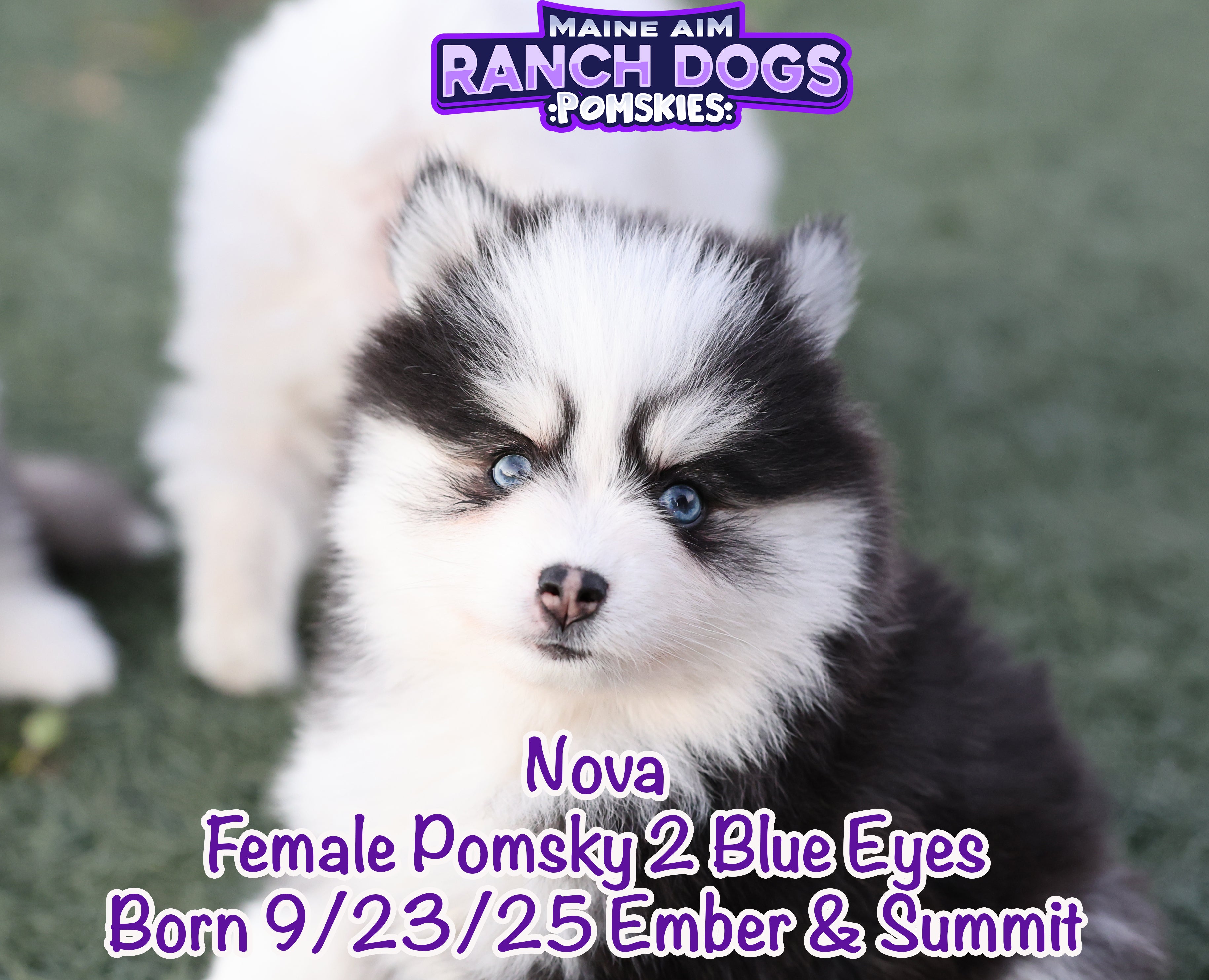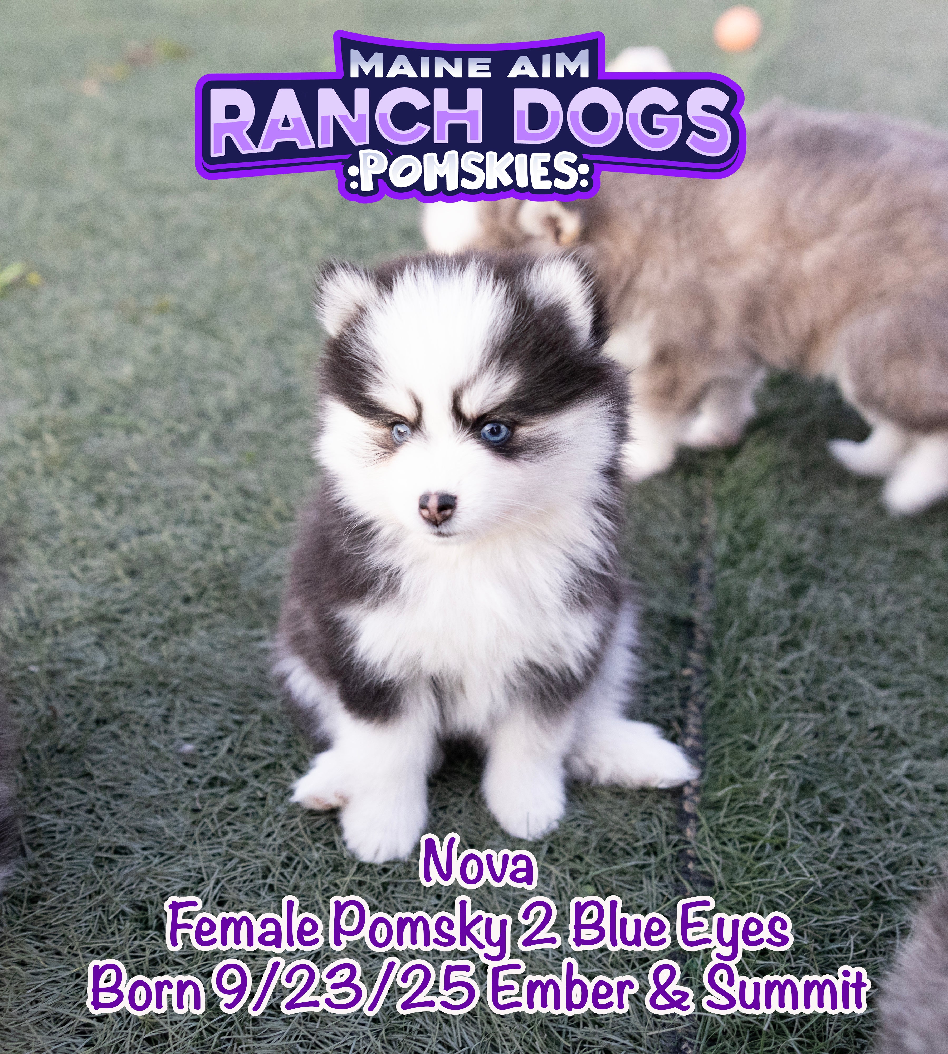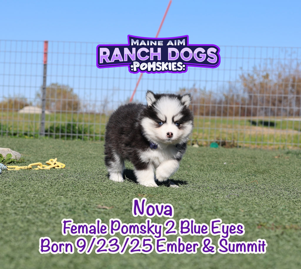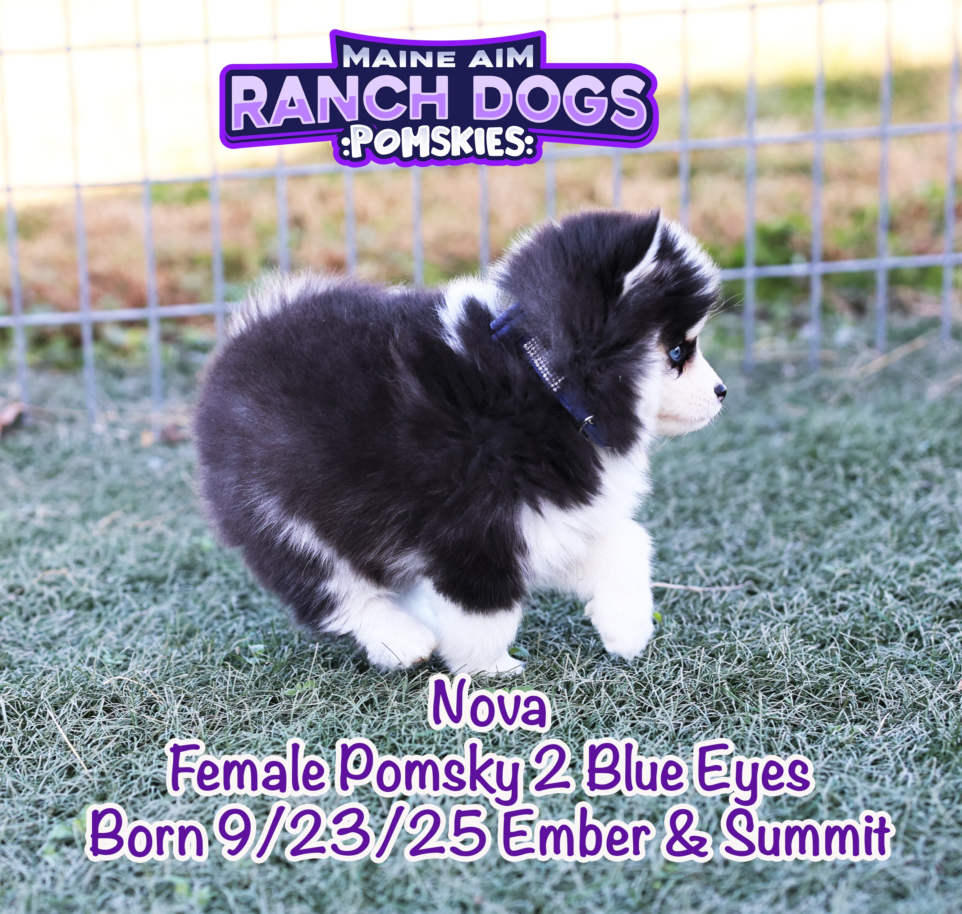 This stunning little girl is now 6 weeks old, and she’s everything you could dream of in a Pomsky! 💕 Nova has a striking black and white coat, a beautiful husky mask, and two dazzling blue eyes that sparkle with sweetness and curiosity.
