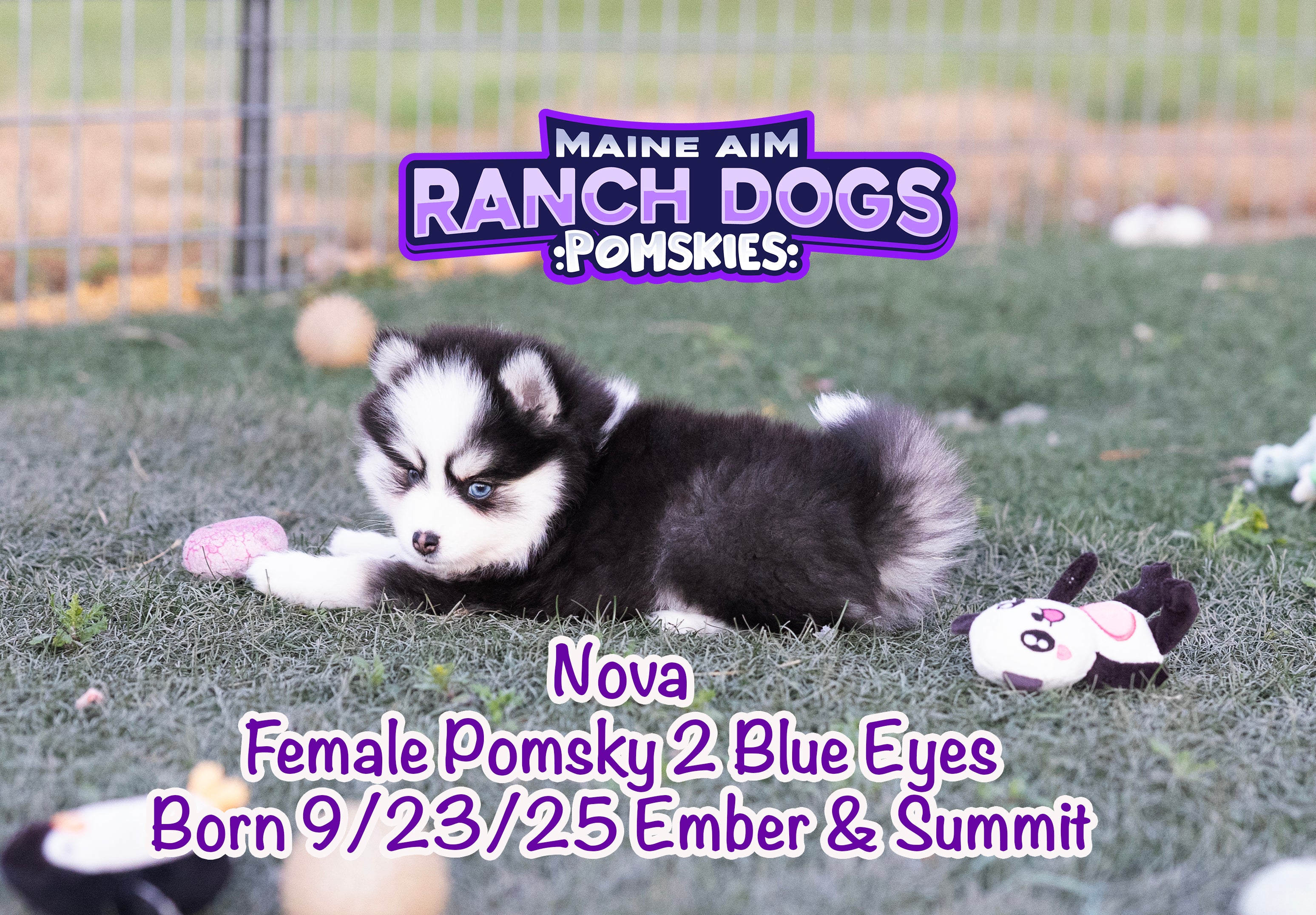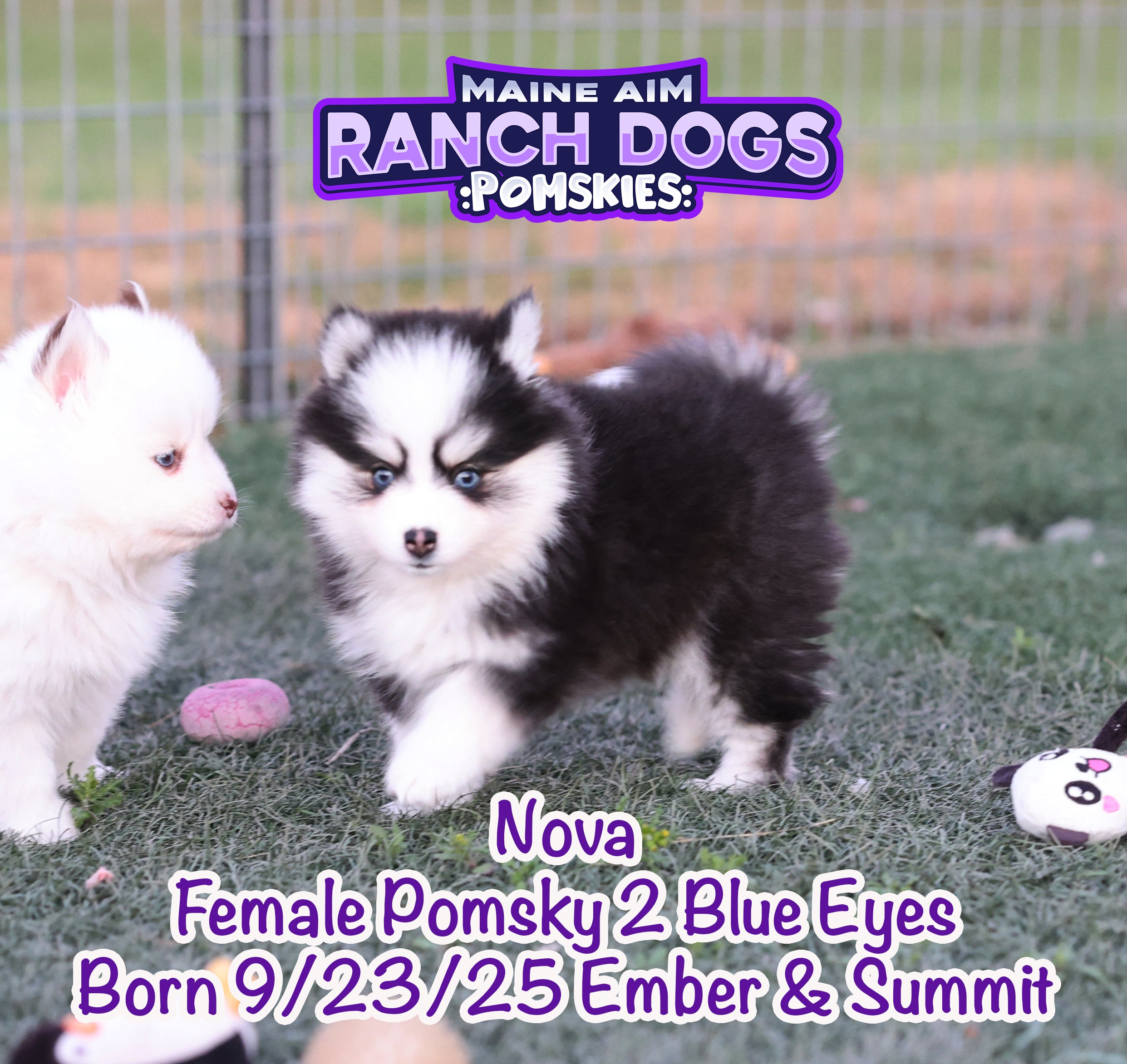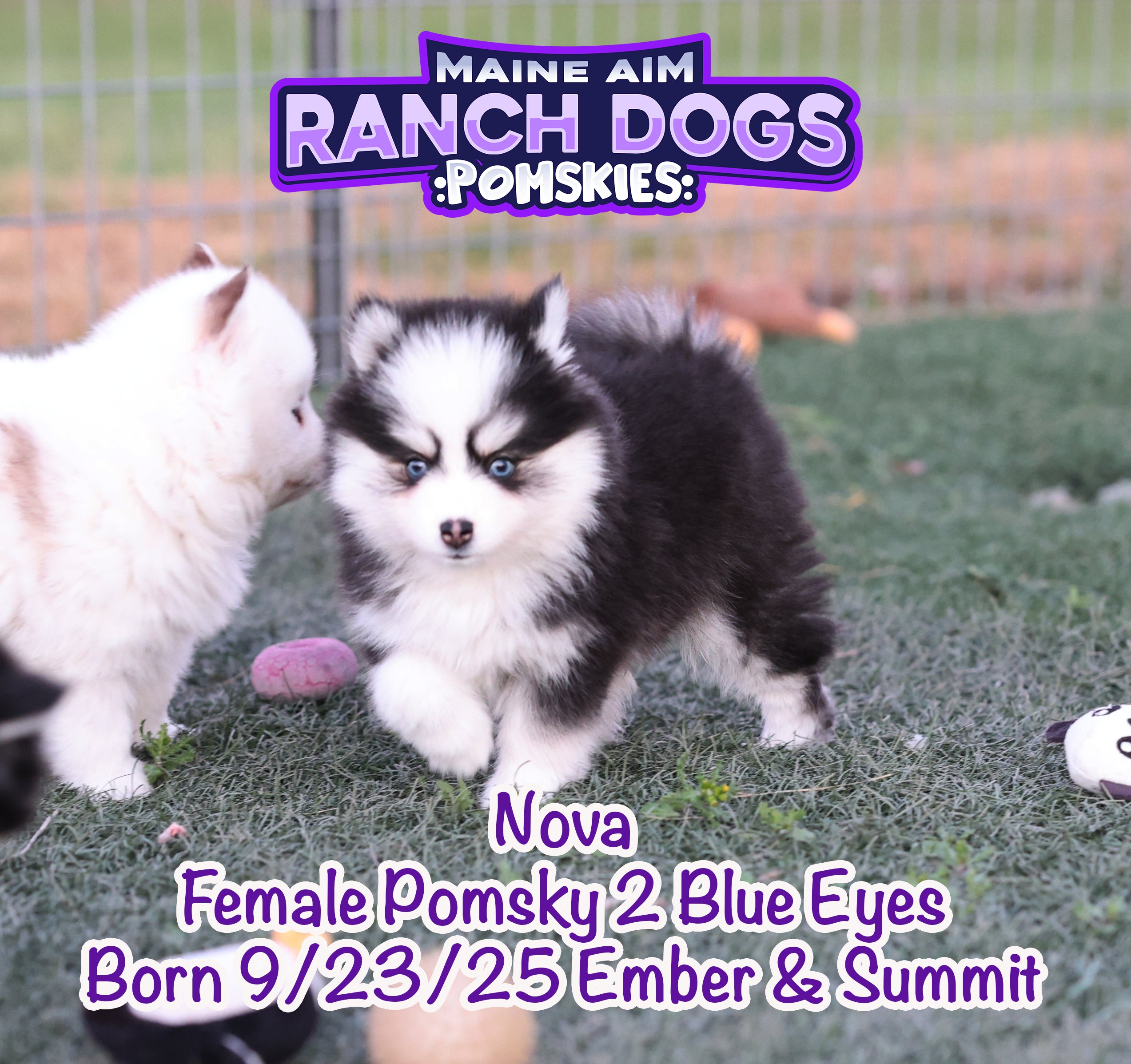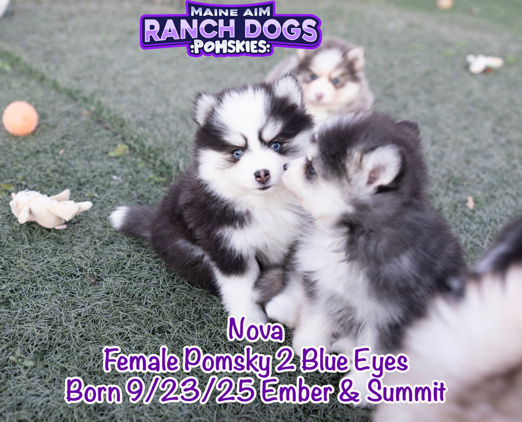 This stunning little girl is now 6 weeks old, and she’s everything you could dream of in a Pomsky! 💕 Nova has a striking black and white coat, a beautiful husky mask, and two dazzling blue eyes that sparkle with sweetness and curiosity.