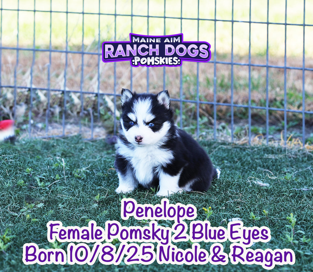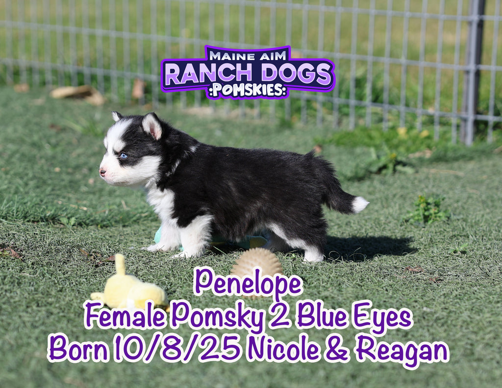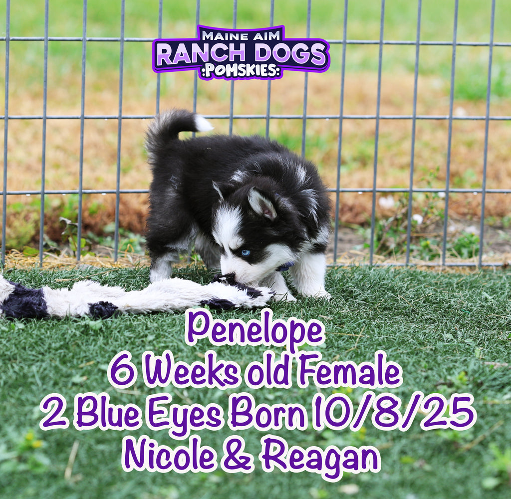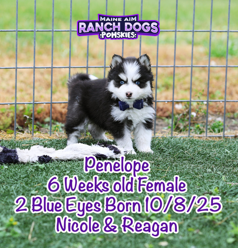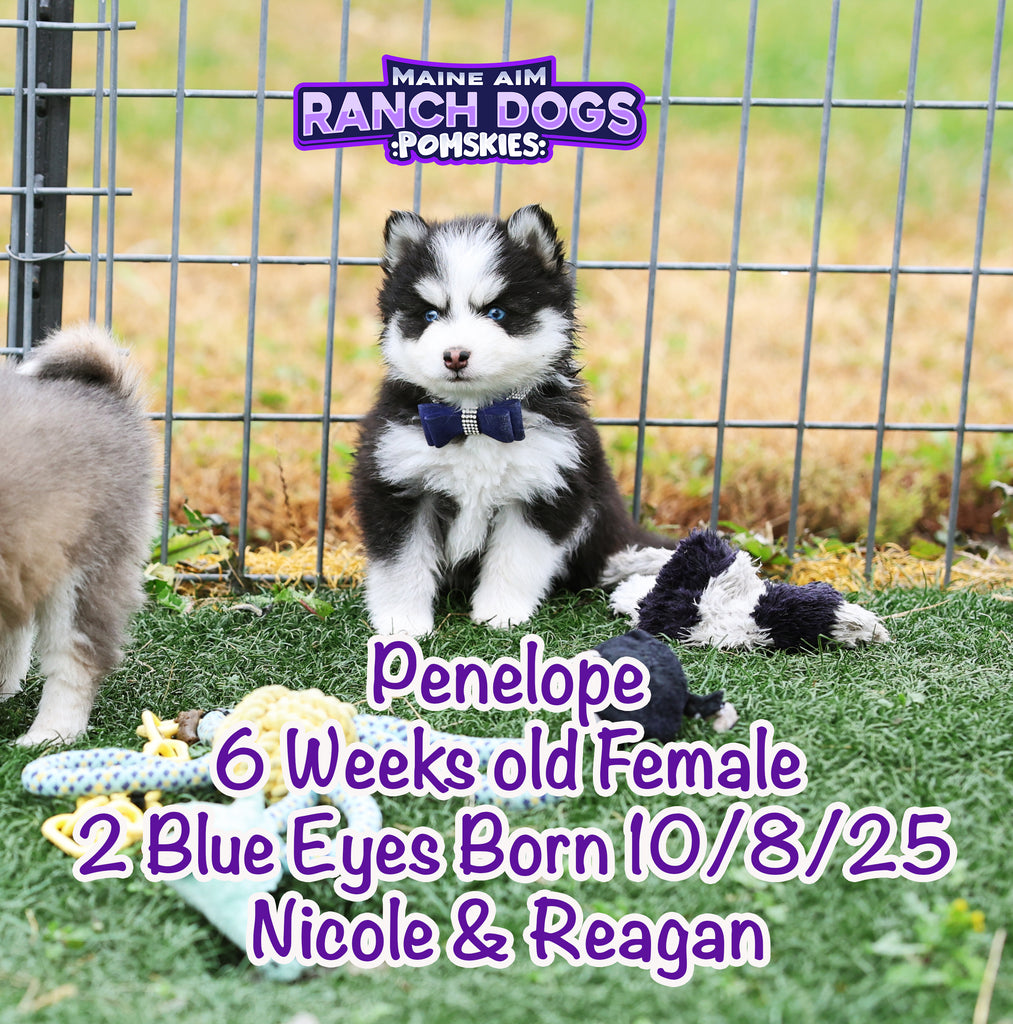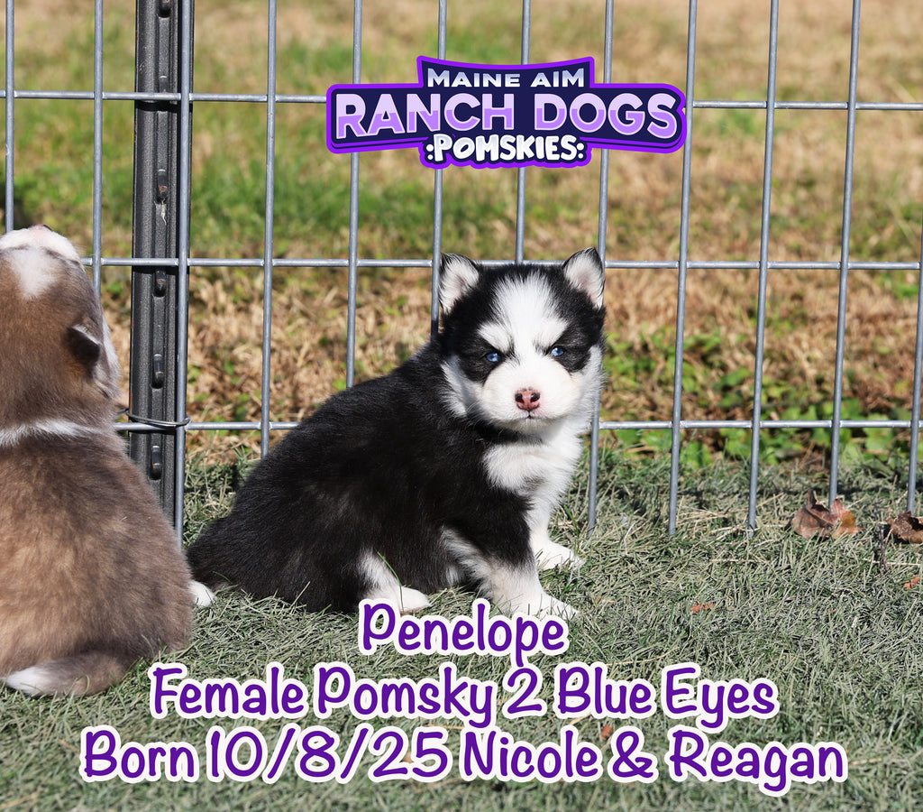 Get ready — this little girl is the kind of puppy who stops you in your tracks and steals your heart before you even know what happened! Penelope is a stunning black and white Pomsky with a classic husky mask, two crystal blue eyes, and a presence that feels downright magical. 💙✨