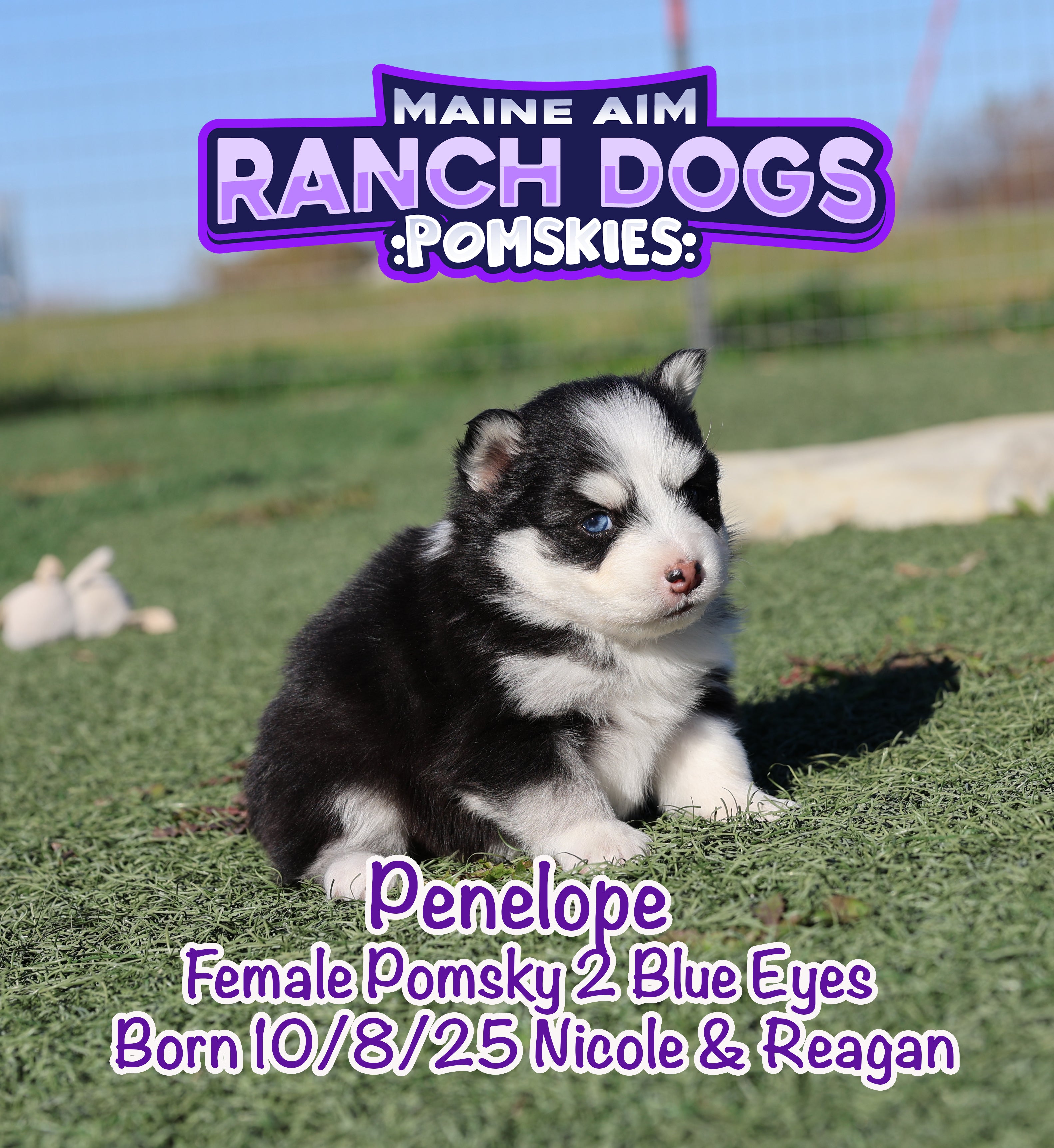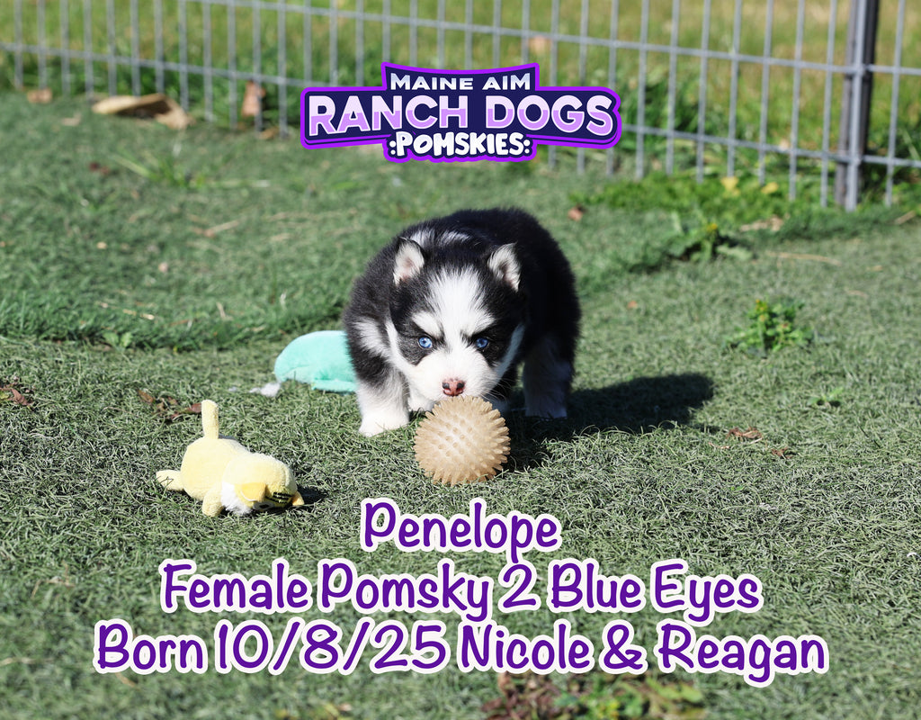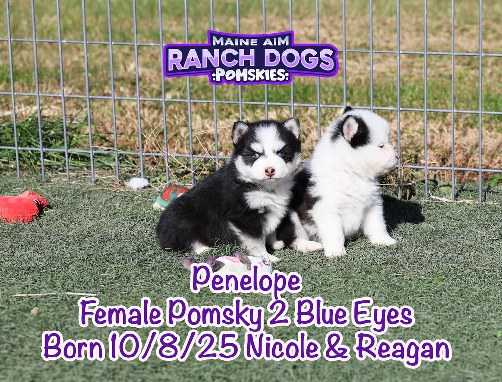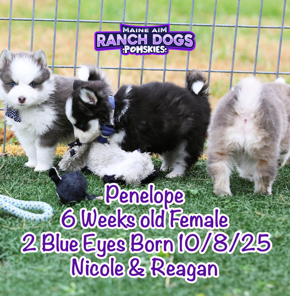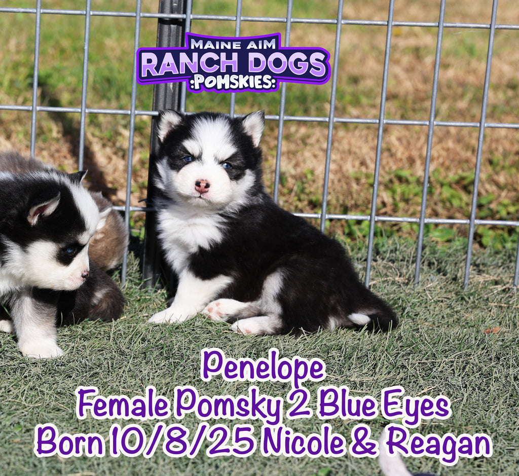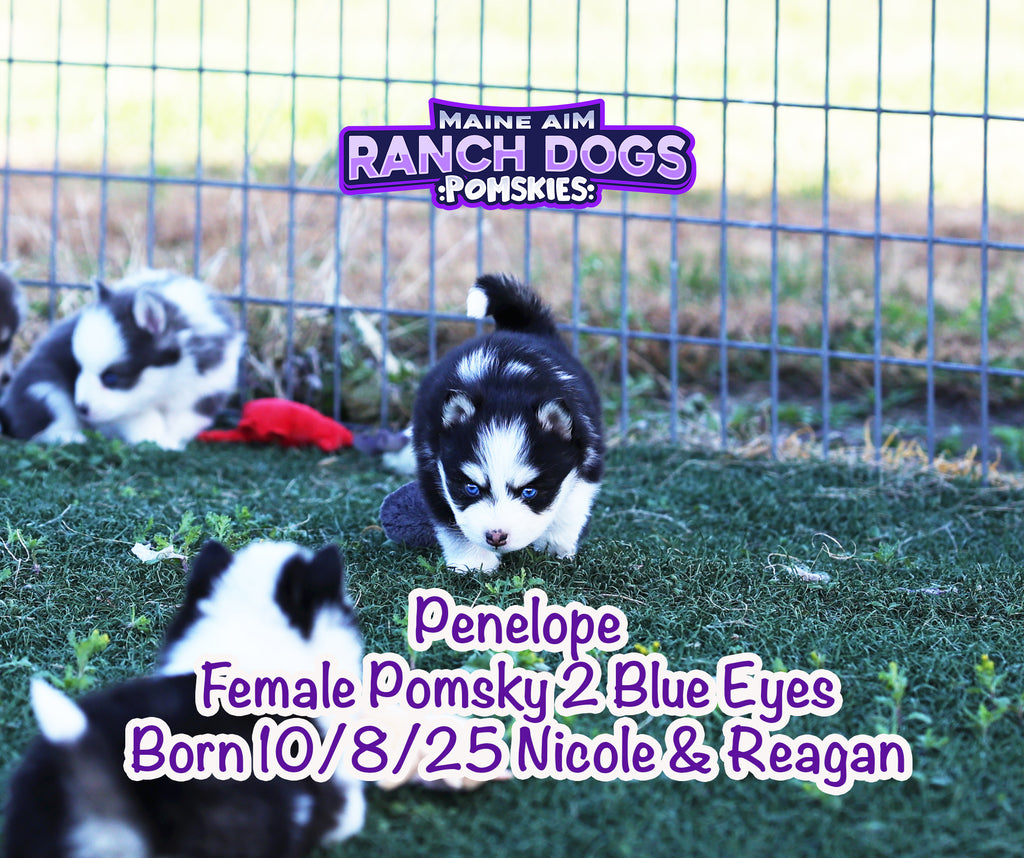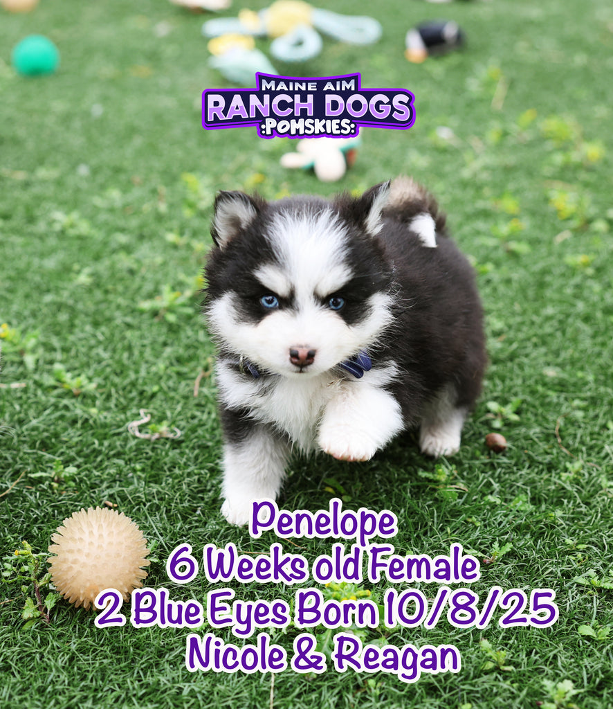 Get ready — this little girl is the kind of puppy who stops you in your tracks and steals your heart before you even know what happened! Penelope is a stunning black and white Pomsky with a classic husky mask, two crystal blue eyes, and a presence that feels downright magical. 💙✨