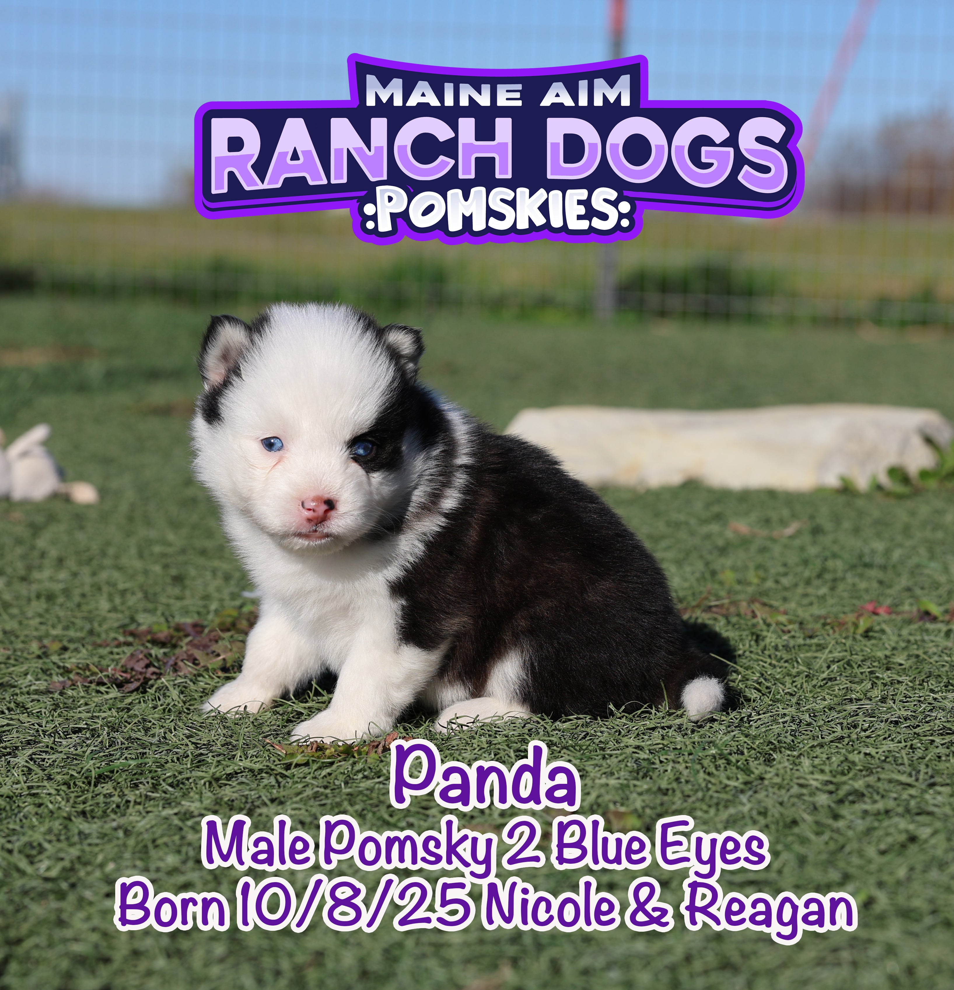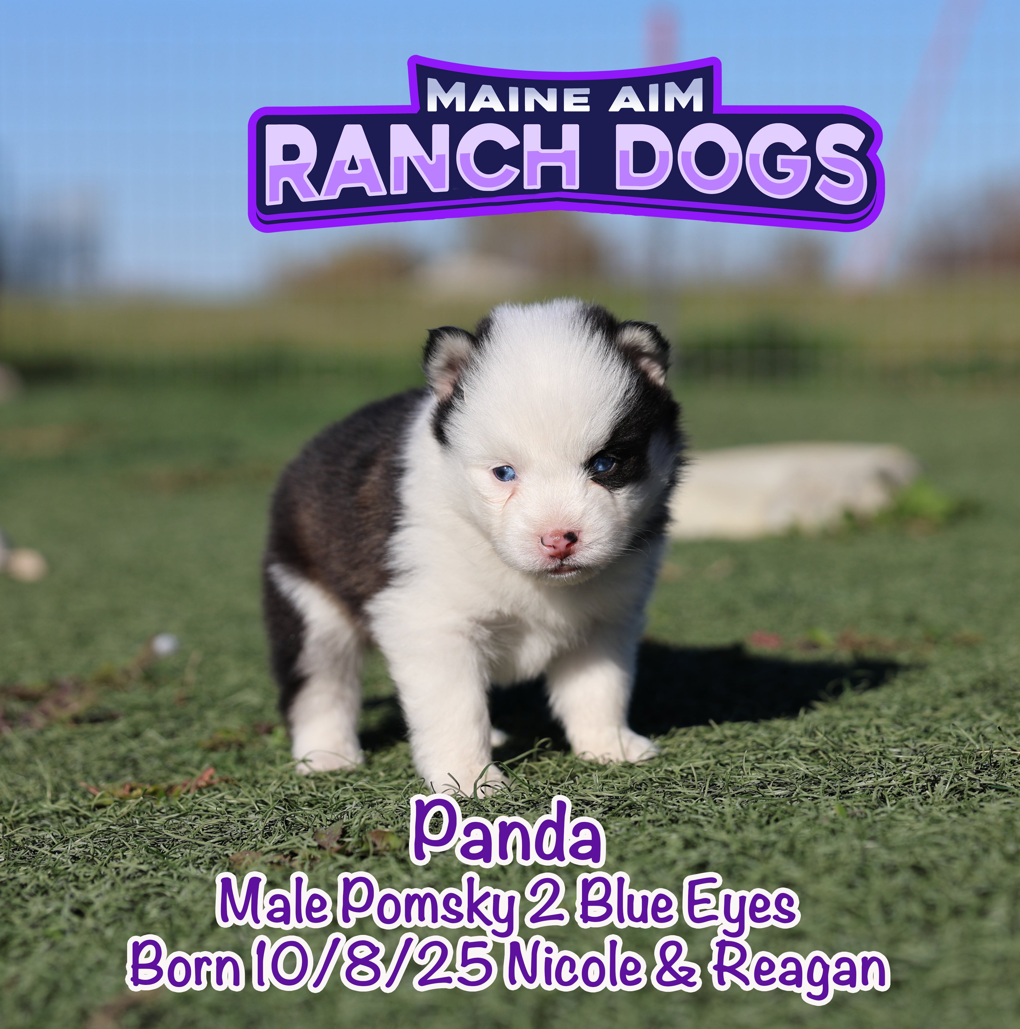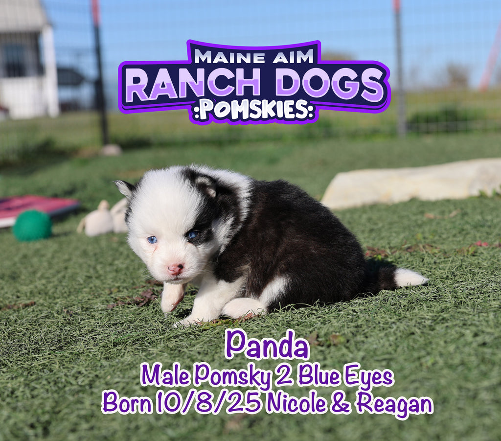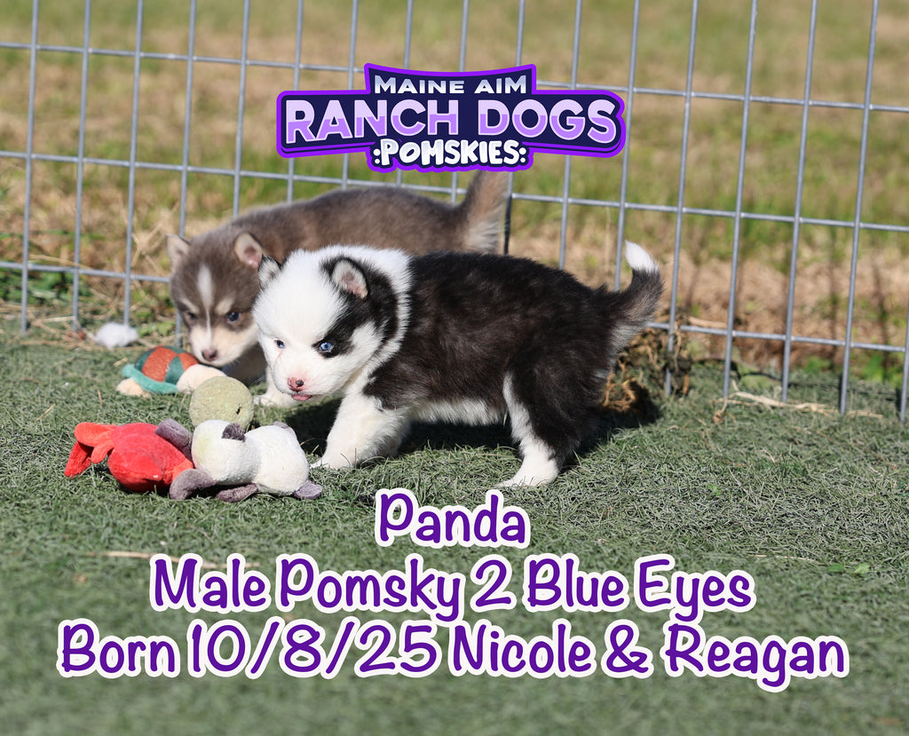 If there was ever a name that fit perfectly — it’s this little guy! šŸ–¤šŸ¤ Panda is a stunning black and white Pomsky with the most unique ā€œpanda bearā€ look — one side of his face pure white with a white eye patch, and the other side black over his eye. It’s like God painted him with a perfect little brushstroke of creativity! šŸŽØ He has two striking blue eyes, a soft fluffy coat, and that irresistible charm that melts your heart the moment you hold him. Panda is out of Miss Nicole and Reagan, and this first-time pairing has truly blessed us with some exceptional babies. We expect Panda to mature around 12 pounds as an adult — just the right size for snuggles and travel. What makes Panda even more special is his temperament — he’s quiet, cuddly, and full of love. The kind of puppy that just wants to be close, soak up affection, and bring peace to any home he’s in. 🩵 At Maine Aim Ranch Dogs, we pray over each of our pups and trust that God will guide them to the perfect family. Panda is such a gift, and we can’t wait to see where the Lord places him. šŸ™šŸ¼šŸ¾Ā
