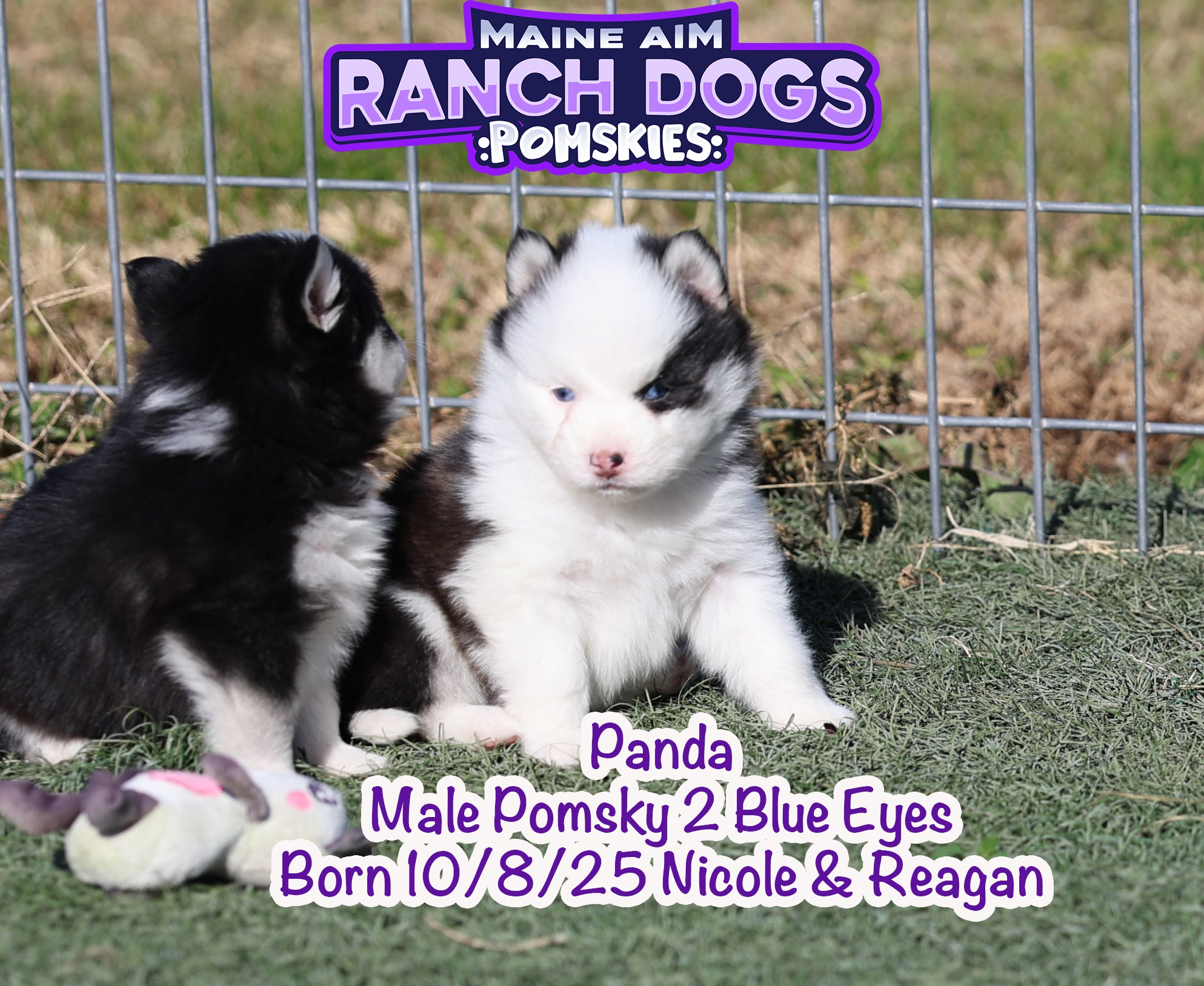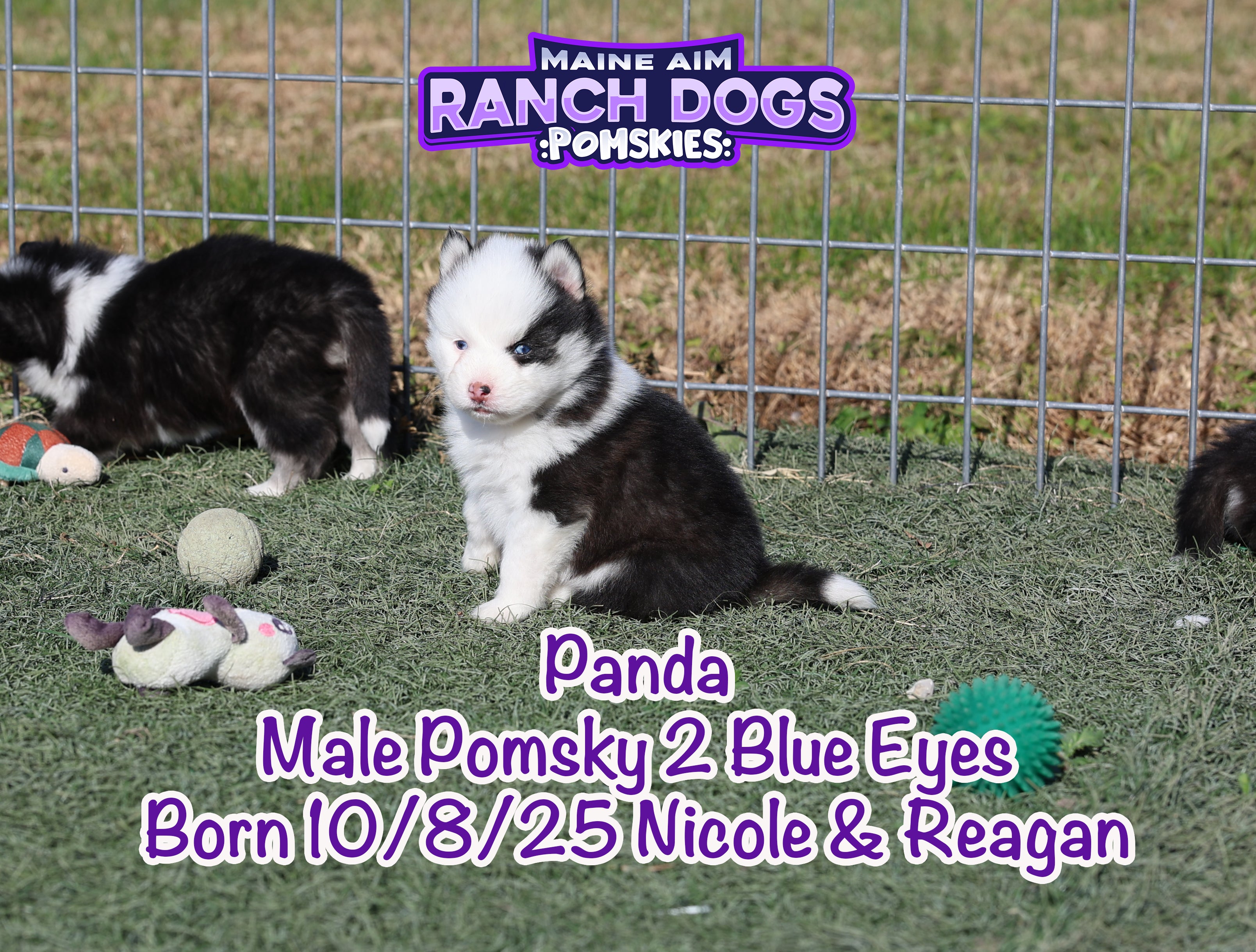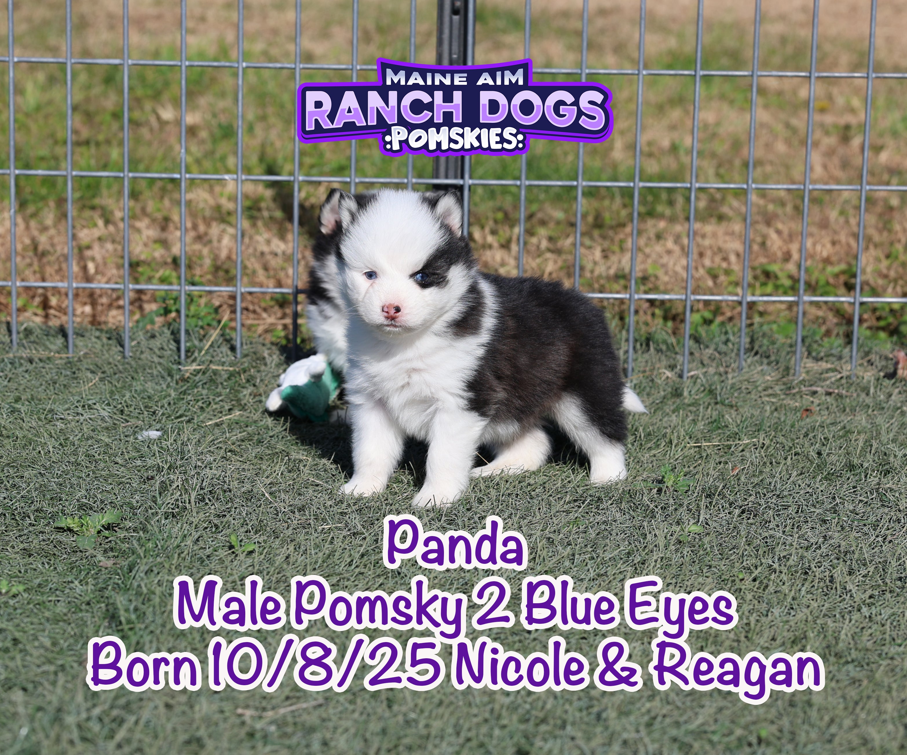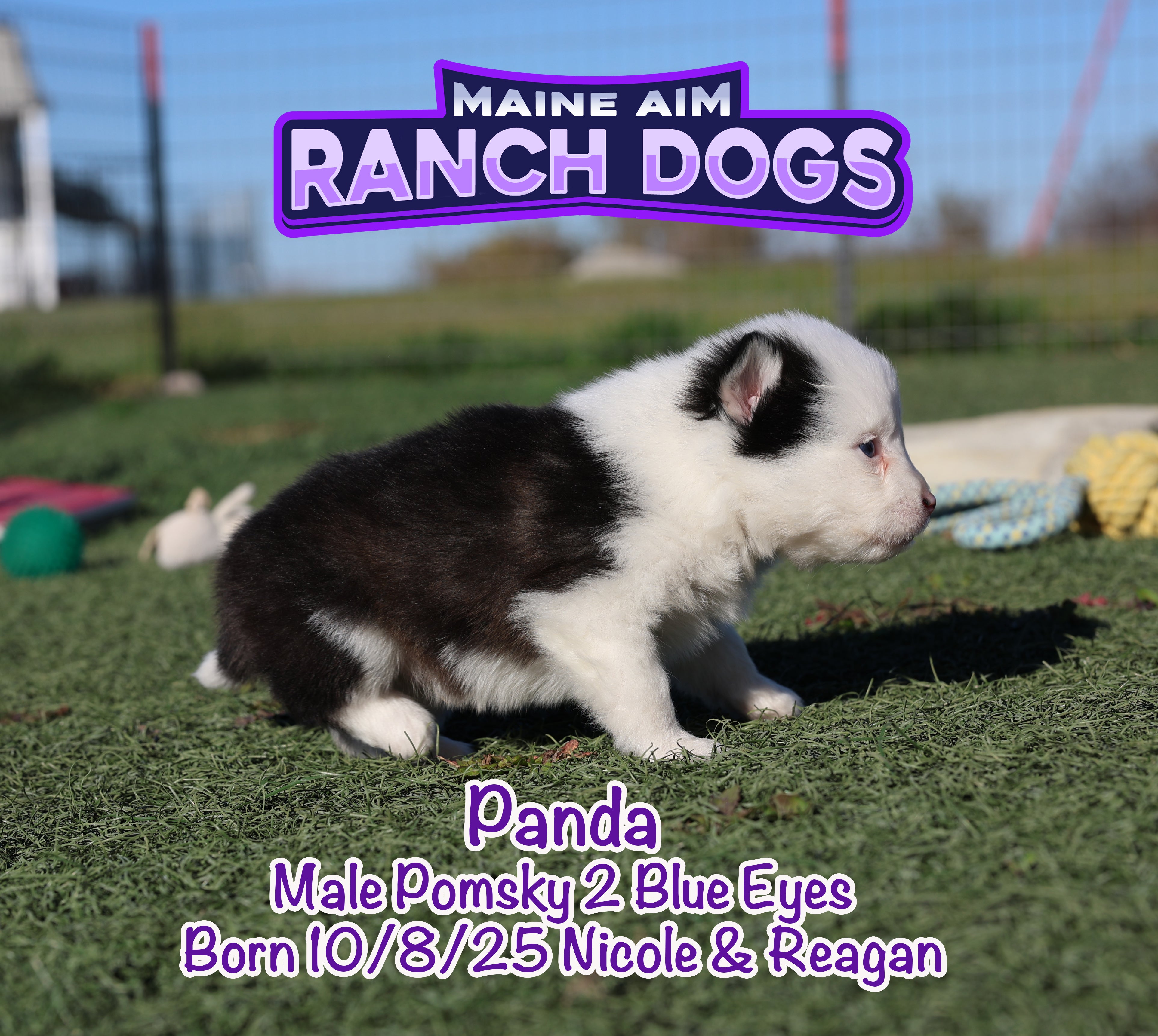 If there was ever a name that fit perfectly — it’s this little guy! šŸ–¤šŸ¤ Panda is a stunning black and white Pomsky with the most unique ā€œpanda bearā€ look — one side of his face pure white with a white eye patch, and the other side black over his eye. It’s like God painted him with a perfect little brushstroke of creativity! šŸŽØ He has two striking blue eyes, a soft fluffy coat, and that irresistible charm that melts your heart the moment you hold him. Panda is out of Miss Nicole and Reagan, and this first-time pairing has truly blessed us with some exceptional babies. We expect Panda to mature around 12 pounds as an adult — just the right size for snuggles and travel. What makes Panda even more special is his temperament — he’s quiet, cuddly, and full of love. The kind of puppy that just wants to be close, soak up affection, and bring peace to any home he’s in. 🩵 At Maine Aim Ranch Dogs, we pray over each of our pups and trust that God will guide them to the perfect family. Panda is such a gift, and we can’t wait to see where the Lord places him. šŸ™šŸ¼šŸ¾Ā
